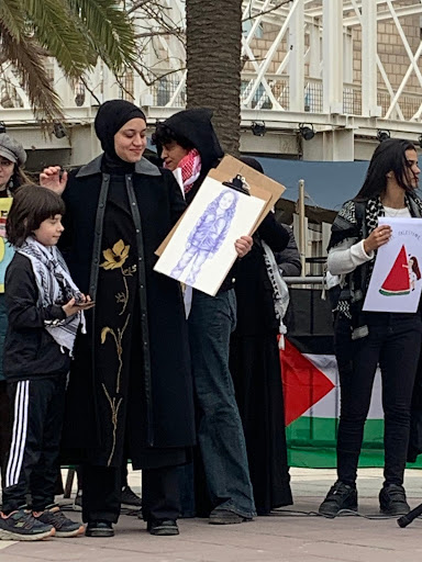 After the speeches, artist María del Mar Gregorio presented Wassam with the original drawing of Hind, “mother to mother”. In a very emotive scene, the crowd chanted “Wissam, Wissam, you are not alone”.
